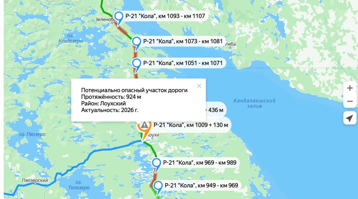 На официальном сайте Упрдор «Кола» появилась карта с указанием потенциально опасных участков федеральной трассы