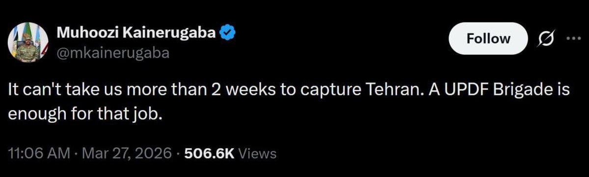 На захват Тегерана у нас уйдёт не больше двух недель — начальник Вооружённых сил Уганды Для этой задачи достаточно одной бригады Сил обороны Уганды, отметил он