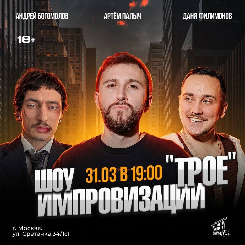 !!! Импровизация - жанр, юмор в котором раждается прямо на сцене, каждая мелочь может переломить ход событий и отправить сюжет по совершенно новому направлению А что самое весёлое, на всё происходящее можешь влиять и ты, становясь полноправным соавтором шоу Ну а исполнителями всего этого импровизационного буйства будут участники проекта "Импровизация. Команды" на ТНТ 😎Андрей Богомолов 🤯Артём Палыч 🤪Даня Филимонов 🤩Improv шоу "Трое" 🤩 31 марта 19:00 🤩 Comedy34 ул.Сретенка 34/1с1 🤩 Билеты тут ‼️МЫ ТЕПЕРЬ И В MAX‼️