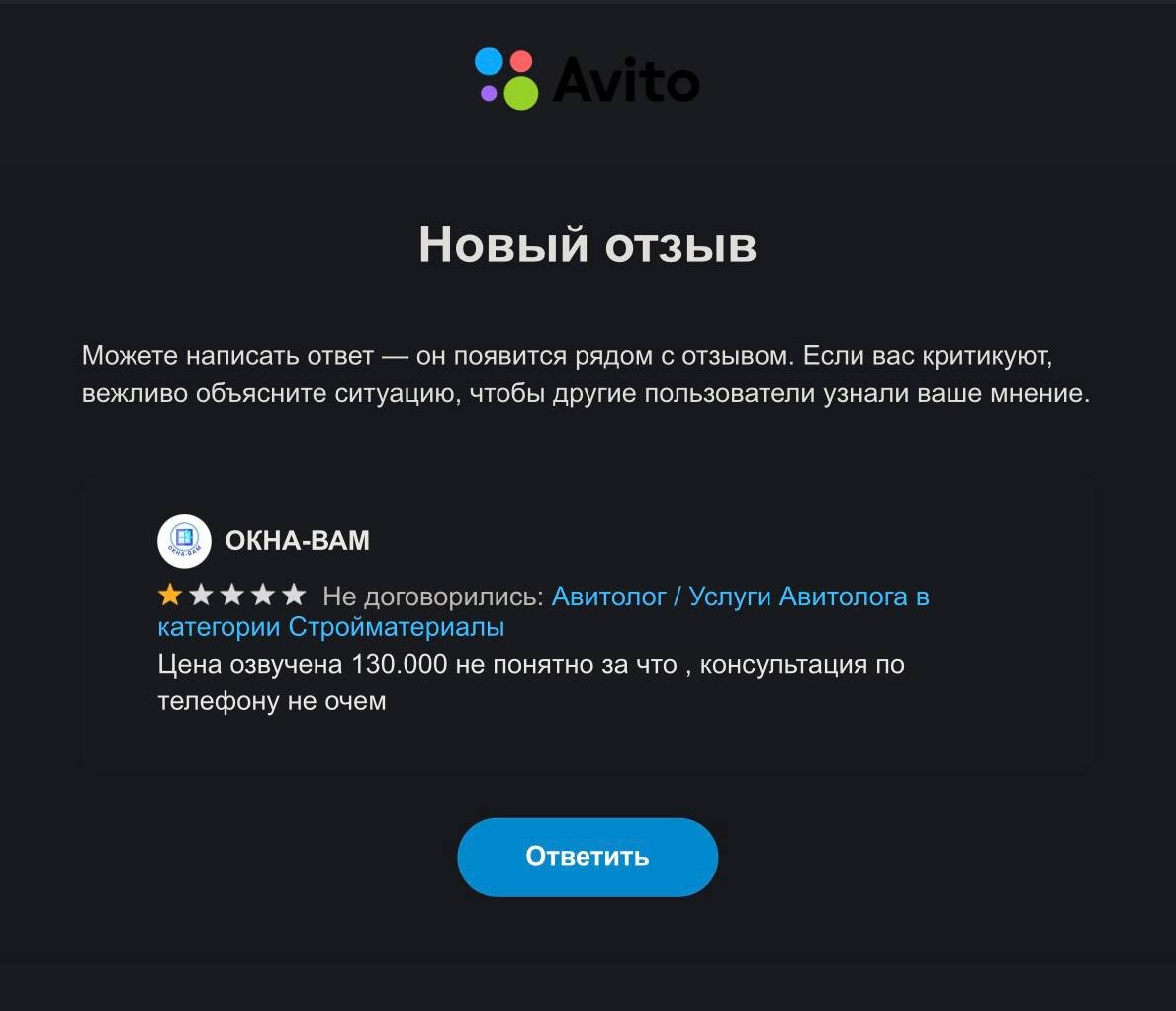 Такой вот отзыв сегодня поступил…