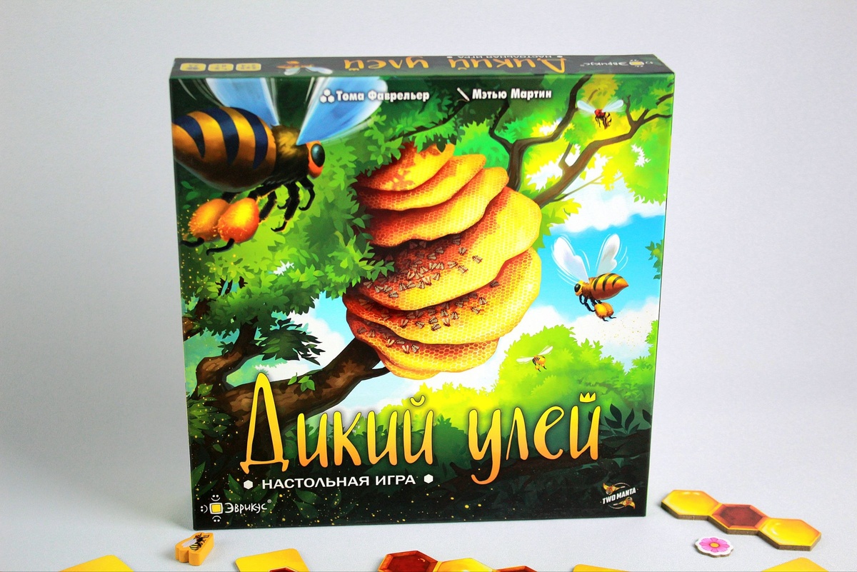 🦔 Дикий Улей - глубокая тактика, пространственная головоломка с тайлплейсментом, набором победных очков, активным взаимодействием игроков и двумя режимами игры. ⚙️Механики: ➡️Глубокая тактика - в игре нет рандома, она как шахматоподобная, можно многое просчитать. ➡️Пространственная головоломка - игроки собирают 3D поле из полиминошек с определенными ограничениями и условиями. ➡️Тайлплейсмент - игроки по очереди набирают полиминошки с общего рынка тайлов, а затем выставляют на поле. ➡️Набор победных очков - игроки собирают очки двумя путями. Либо собирая несгораемый мед, либо расставляя и перемещая пчелок. Пчелки приносят очки в зависимости от положения на поле. ➡️Активное взаимодействие - игроки могут перемещать по полю шершней и буквально съедать вражеских пчелок. Также есть много особых действий, которые меняются от партии к партии. ➡️Два режима игры - каждый сам за себя и полукомандный 2 на 2. Плюсы: ✅ Редкая тема пчел, при этом она гармонична с геймплеем. Очень крутое качество