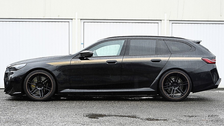Германское тюнинг-ателье Manhart представило доработанный спортуниверсал BMW M5 Touring поколения G99: мощность его гибридной силовой установки увеличена 727 до 910 л.с. В начале осени прошлого года компания Manhart представила проект MH5 900E в кузове седан на базе актуального BMW M5 (G90), и только теперь появилась аналогичная машина в кузове универсал (G99). Напомним, что исходный BMW M5 Touring справил премьеру летом 2024 года и шокировал общественность своей тяжеловесностью. Из-за plug-in гибридной силовой установки снаряженная масса «сарая» достигла 2475 кг. Под стать массе и грузный облик автомобиля, которые не в состоянии компенсировать даже очень большие колёса. Manhart установила на MH5 900E Touring собственные 22-дюймовые кованые «катки» Concave One. Из новых кузовных деталей универсал получил только развитый спойлер в нижней части переднего бампера, а в остальном новый образ создают фирменные декоративные полосы и наклейки Manhart. Подвеска занижена, причём можно выбрать од