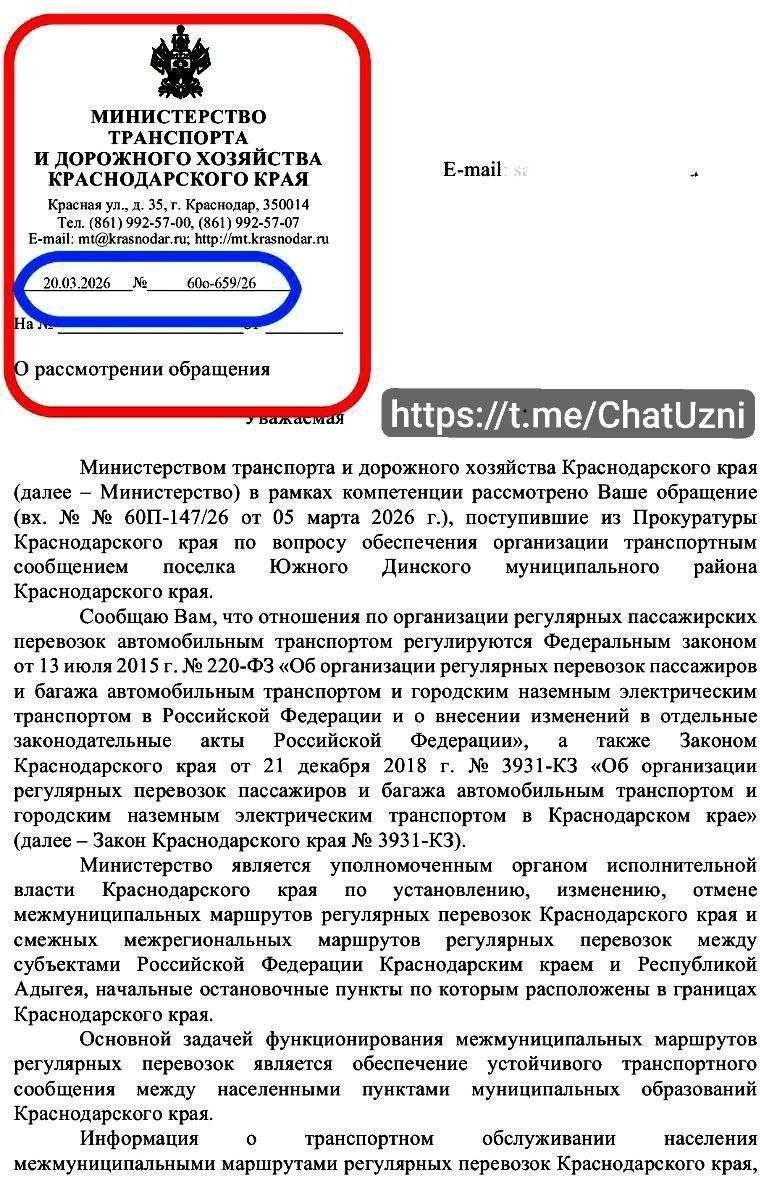 😳😳😳 Маршрут из Южного в Динскую через Новотитаровскую! Предварительные итоги работы инициативной группы КП «Южная Столица» при поддержке жителей посёлка Южного. В марте 2026 года из Министерства транспорта Краснодарского края поступил ответ из которого стало известно, что: ✅ Установлен новый межмуниципальный маршрут № 227 «п. Южный – ст. Новотитаровская – ст. Динская». ✅ Объявлен открытый конкурс на право получения свидетельства об осуществлении перевозок по этому маршруту. Таким образом, вопрос прямого сообщения «Южный – Новотитаровская – Динская» перешёл в практическую плоскость: маршрут утверждён, идёт процедура определения перевозчика. Это результат нашей общей системной работы: жалоб, встреч, обращений в Прокуратуру, Губернатору и Администрацию Президента. 🛃🛃🛃🛃 Инициативная группа жителей КП "Южная Столица" продолжает контролировать ситуацию, а также продолжает добиваться, чтобы и внутрипоселковый маршрут также стал реальностью, для улучшения транспортной доступности