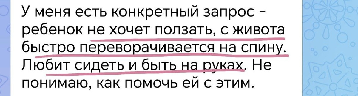У моей третьей дочки Полины была аналогичная ситуация: до 6 месяцев была активный ребёнок, все были уверены - вот вот поползет. А в 6 месяцев она залезла на руки к маме и не слезала до 8 мес. Мы занимались на руках всем чем могли: правильный хэндлинг, много боковых позиций, упражнения (да, да, прямо на руках мамы, не слезая с них). В 8 мес Полина слезла с мамы и через 2 недели уверенно поползла Все дальнейшее развитие в рамках нормы - правильно, красиво, симметрично и виртуозно. Хоть и по крайней границе возрастных норм - и это нормально, у каждого свой путь развития👌 Вопрос ползания решается Или на Курсе позы контакта, тариф с индивидуальным сопровождением Или в клубе можно начать работу, но она будет не такой глубокой, как на курсе Часто этого бывает достаточно👌 Также можно зайти в бесплатную демо группу 3-6 мес и заниматься по теме ползание по пластунски ✔️Клуб https://dzen.ru/media/rutschool/vstupit-v-klub-ekateriny-rut-rutschoolclub-dlia-kogo-polezen-klub-679110ae5abff211d0
