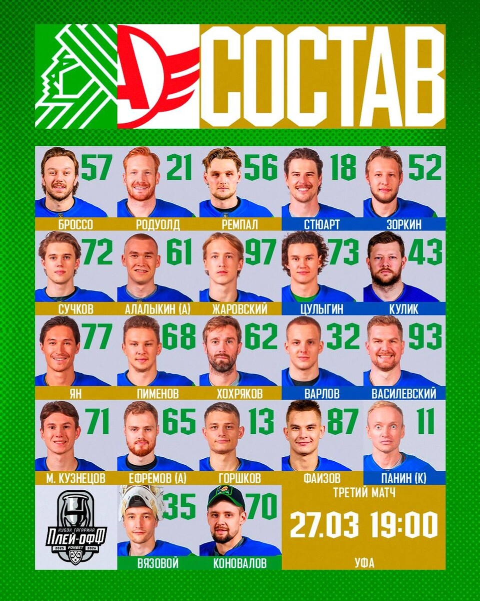 «Салават Юлаев» — «Автомобилист»: составы команд на матч плей-офф КХЛ-2025/2026
