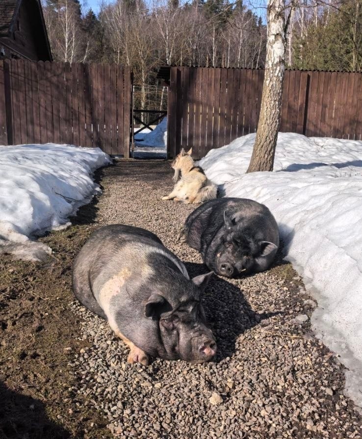 ! К чему мы вас и приглашаем. В эти субботу и воскресенье экскурсии будут и на них еще остались места. Хорошо немного скинуть с себя суету и ритм городской жизни, неспешно погулять, покормить животных и птиц. Попьем нашего любимого травяного чаю с успокаивающими травами (какими? расскажем!) Подсыхает земля вокруг качелей, каруселей, батута.... Дети пусть прыгают и бегают, а мы можем неспешно поговорить. Пусть это и прозвучит странновато, но когда хочется отдохнуть - можно брать пример с наших чудесных свинок:) Они никогда не упустят возможность подставить бока весеннему солнышку и подумать о вечном! Это не суетливые альпаки, это умудрённые опытом животные, которые знают толк в отдыхе:)) Приезжайте! Записаться на экскурсию: билеты.