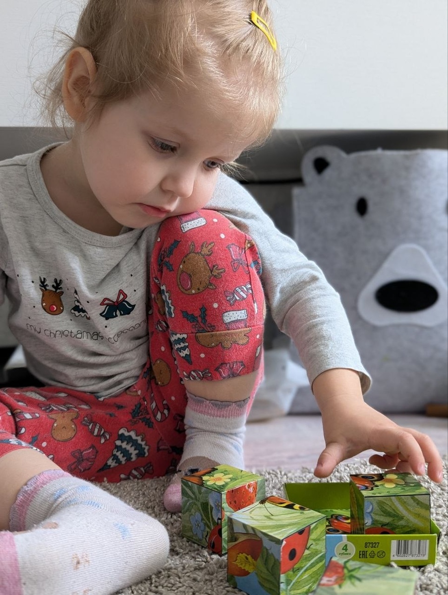 Есения к ним тянулась, но картинка складывалась только с нашим участием. И вот дождались! Сегодня она уже собирает их сама. Кстати, картинка достаточно сложная — я порой и сама ошибаюсь, какой стороной кубик поставить. А это, кстати, отличная тренировка и для внимательности, и для пространственного мышления. Животные, наверное, были бы проще, но меня уж очень умилили эти полянки. 🐞 🌱 Канал «Мам, смотри!» в Tg | Max | Vk