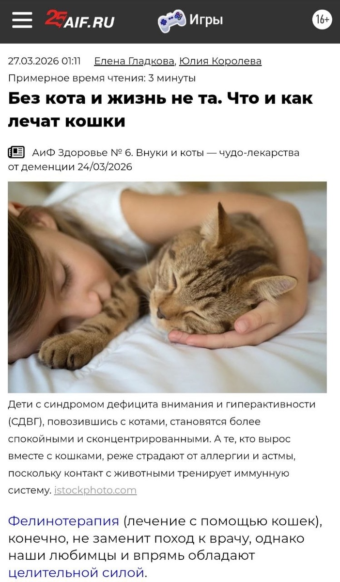 Статья Aif.ru о целительной силе котяшек💞🐈💞