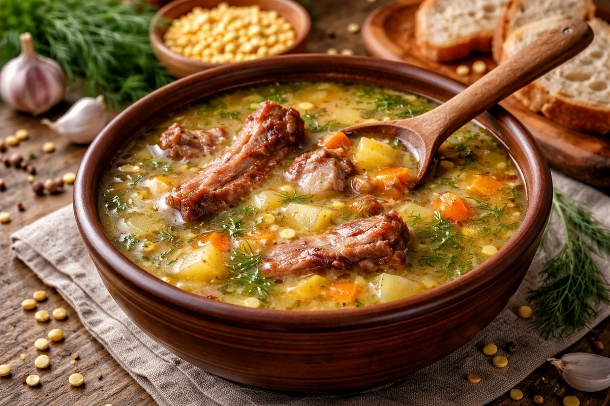 Всем добрый вечер! Знаете, есть блюда, которые вроде бы совсем не по сезону, а всё равно хочется именно их. Вот сейчас уже тепло, солнце, лёгкая еда… А внутри вдруг возникает простое желание — тарелку густого, наваристого супа, чтобы прямо с хлебом, так спокойно, по-домашнему. У меня с гороховым супом только такие отношения. К нему я возвращаюсь всегда, в любую погоду и независимо от настроения. И вот сколько ни пробовала разные варианты, именно этот самый лучший! Главное отличие — это не ингредиенты, а подход. Горох здесь не просто варится, а разварится до мягкости и даёт самую нужную густоту. Бульон получается насыщенный, не водянистый, с ароматом копчёностей и специй. — колотый горох 250 г — вода около 2–2,5 л — копчёные рёбрышки или курица 300–400 г — картофель 3–4 шт. — лук 1 шт. — морковь 1 шт. — чеснок 2 зубчика — лавровый лист 1–2 шт. — соль, перец по вкусу — растительное масло для зажарки Если нет копчёностей, можно взять обычную курицу, но именно копчёности дают нужный вкус.