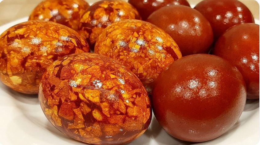 Пасха для меня всегда связана с запахом свежей выпечки и, конечно, с крашеными яйцами. Раньше я пробовала разные способы: и магазинные наклейки, и пищевые красители. Но каждый раз возвращалась к самому простому и проверенному — луковой шелухе. Это самый доступный и безопасный способ. И он же даёт самый красивый результат, особенно если немного похитрить и сделать мраморные яйца. Делюсь своим способом, которым пользуюсь уже много лет. Для окрашивания мне нужно не так много: Чем больше шелухи, тем насыщеннее получится цвет. Я собираю её в течение нескольких недель перед Пасхой — сушу и складываю в бумажный пакет. За пару часов до варки я достаю яйца из холодильника. Они должны согреться до комнатной температуры. Если опустить холодные яйца в горячую воду, они могут треснуть. Это простое правило спасает от неприятных сюрпризов. Луковую шелуху засыпаю в большую кастрюлю, заливаю водой. Ставлю на плиту, довожу до кипения и варю 5 минут. Потом выключаю, накрываю крышкой и оставляю до полного