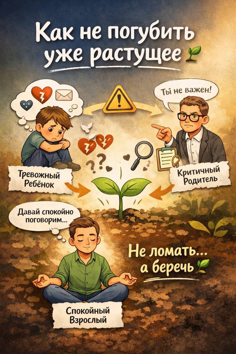 🤗 Как не погубить уже растущее 🌱 Всходы уже есть. Не фантазия, не «показалось» — а что-то живое между вами. И вот здесь начинается самое тонкое… 👉 Не «как найти» 👉 А как не испортить ⸻ В жизни это выглядит очень знакомо: 🌱 Всё было легко… и вдруг один день тишины — и внутри уже не «занят», а: «всё… я опять не нужен(а)» 😶 🌱 Он пишет «скучал» а внутри вместо тепла: «а почему только сейчас?» 🤔 🌱 Всё хорошо… но появляется мысль: «надо срочно определить, кто мы» и лёгкость куда-то исчезает 🪨 И вот здесь ключевая штука 🧠 (чуть психологии) Часто мы реагируем не из реальности, а из своих внутренних состояний: 👶 Ребёнок — тревожится 👤 Родитель — критикует 🧘♂️ Взрослый — смотрит на факты Разберём на живых примерах 👇 💬 «Я говорю всё сразу, что думаю» 👉 звучит как искренность 👉 но часто это тревога Ребёнка «мне нужно срочно прояснить, иначе я не выдержу неопределённость» ⸻ 🌫️ «Он молчит — и это сразу яма» 👉 это не про него 👉 это про старый опыт «если нет ответа — м