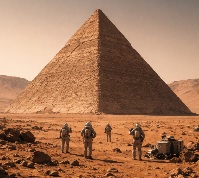 В сети появился очередной вирусный пост: конспирологи обнаружили на снимках NASA (Mars Global Surveyor, 2001 год) трехстороннюю пирамиду в районе Каньона Кандор (часть долины Маринер) и заявили, что она напоминает по размерам Великую пирамиду в Гизе. Автор находки, называющий себя «журналистом по раскрытию информации о Марсе», назвал ее доказательством существования древней внеземной цивилизации. Изображение: Flux ai Планетологи и геологи быстро охладили пыл конспирологов. Паскаль Ли из Mars Institute и SETI Institute объяснил, что формация имеет слоистую структуру, характерную для этого региона, и скорее всего образовалась под действием ветровой эрозии. «Ничто здесь не кричит об инопланетной археологии», — заявил он. Пирамида найденная на фото NASA. Источник фото: futurism.com Кроме того, египетские пирамиды имеют четыре стороны (или даже восемь), а у марсианской пирамиды их три. Это ставит под сомнение аналогию. На Земле существует множество природных пирамидальных форм, от горы Серр