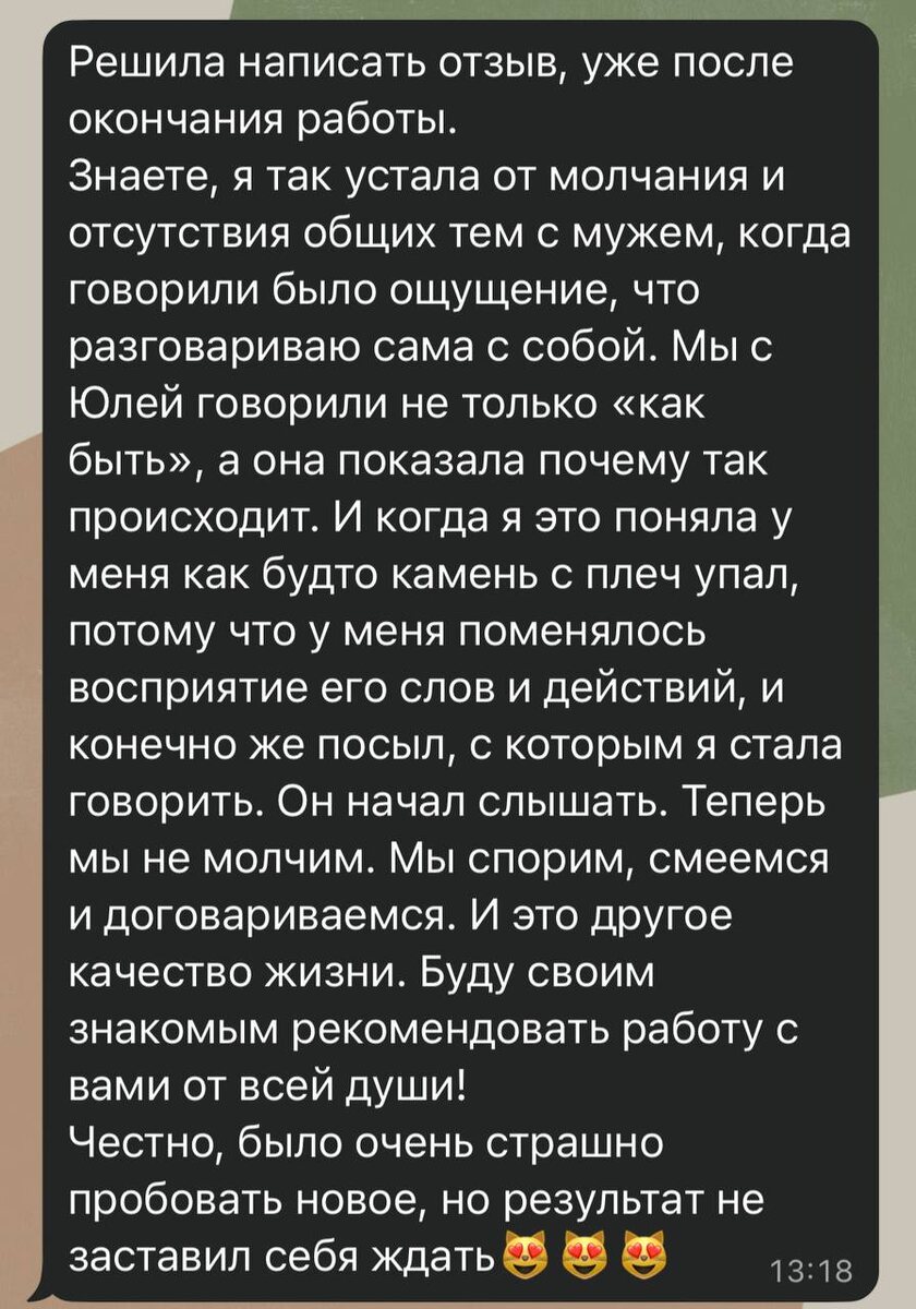 Алина пришла ко мне в программу «Диалоги по мотивам» после 12 лет брака. Сказала: «Юля, я устала. Я как белка в колесе: работа, дом, дети, готовка, уборка. Я всё это делаю. А он сидит у телевизора после работы и даже не замечает меня. Я чувствую себя пустым местом». Нет, она не хотела уходить от него. Она хотела, чтобы её наконец увидели. ▶️Мы начали не с претензий к мужу. А с того, что она перестала делать за двоих. Я дала ей простое задание на первой недели: одну неделю не доделывать за ним, не напоминать, не доказывать. Просто жить свою жизнь (а это очень не просто) и замечать, когда внутри включается «я должна». Первая неделя была сложной. Алина ловила себя на желании проконтролировать всё. На второй недели мы добавили вопросы к мужу о нем. И после случилось «чудо». Муж сам вынес мусор. Сам спросил: «Ты устала? Давай я заберу детей». Она сказала: «Мне страшно это говорить, но мне нужна твоя помощь». И он не отвернулся. Сейчас Алина не живёт в режиме «доказывания». Она просит,