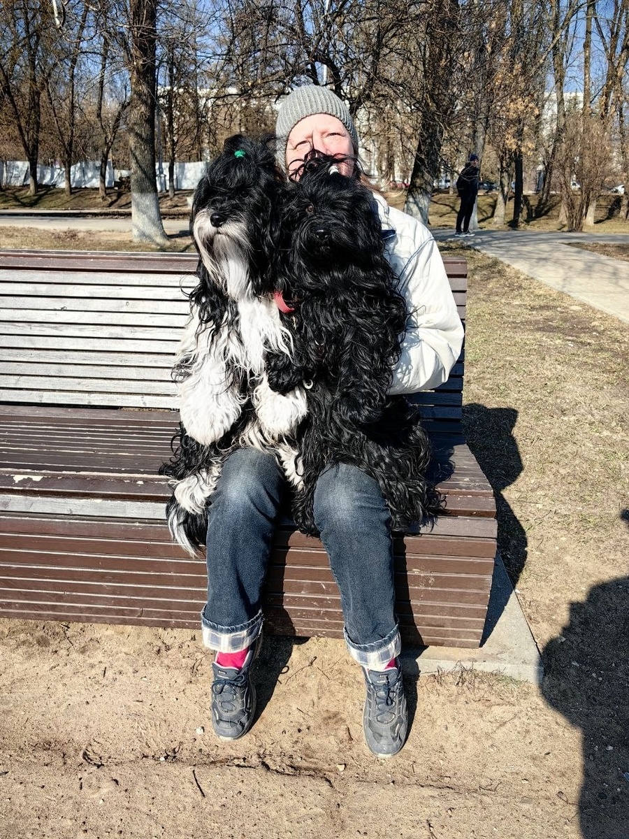 ☀Весеннее солнце рисует золотые узоры на набережной Волги. Я сижу на скамейке, а на коленях — мои пушистые сокровища: ГолдиТиТишки Лаврик и Ева.