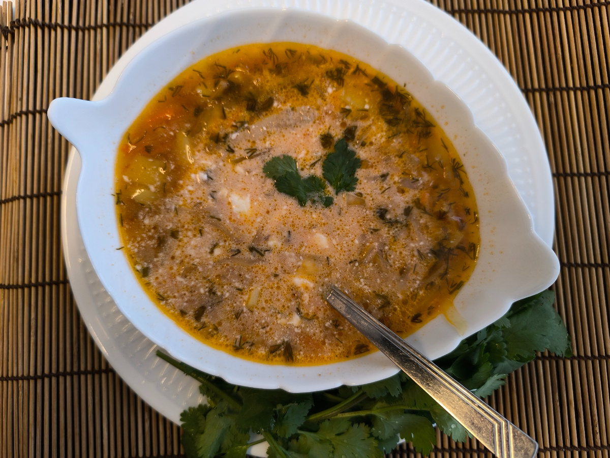 В общем на завтрак у нас щи с уткой. Мы довольно часто едим на завтрак сытные мясные супы, которые забеливаем сметаной. Или пельмени с бульоном, в который добавляем кусочек сливочного масла, перец, зелень и забеливаем сметаной. В общем завтрак у нас можно назвать традиционный. После такого завтрака мы чаще всего обедаем и ужинаем одновременно. У нас то ли поздний обед, то ли ранний ужин, после которого мы можем выпить кефира или съесть фрукт.