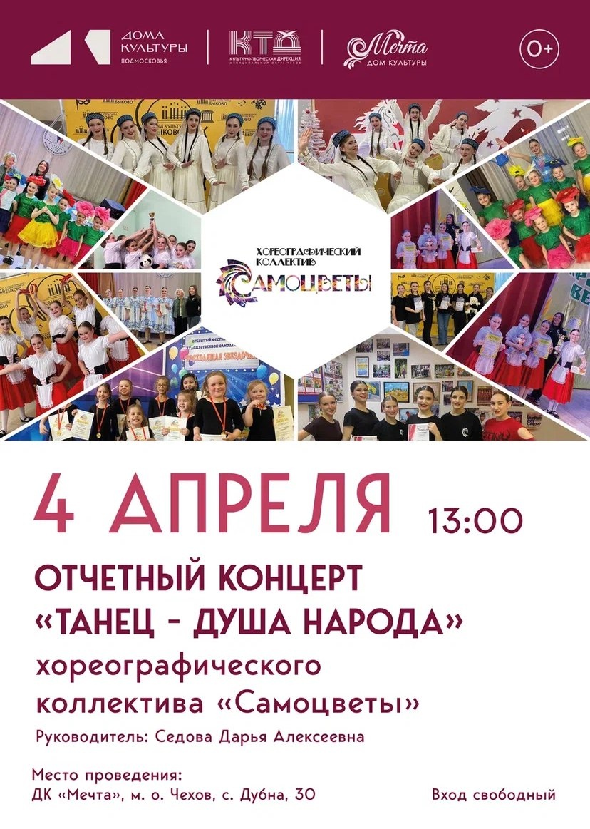 ✨ отчетный концерт хореографического коллектива «Самоцветы» в ДК «Мечта» 🩰 Вас ждут яркие номера, эмоциональные постановки и зажигательные танцы под прекрасные мелодии. 📆 04.04.2026 🕛 13:00 🏢 ДК «Мечта» 📍 г.о. Чехов, с. Дубна, д.30 🪙 Вход свободный❗️ ⭐Поддержать канал голосом ✅ Мероприятия Чехов https://dzen.ru/id/66cc4b48e9ef144699238a51 https://vk.ru/chekhov_events http://dzen.ru/chekhov_events