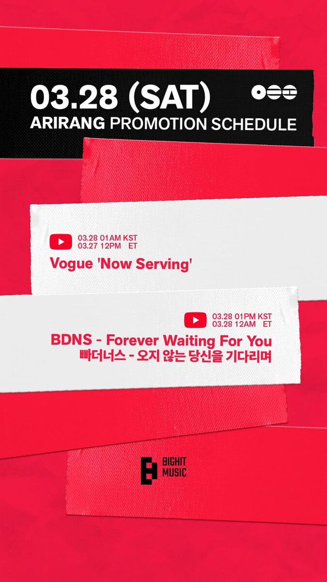 : Расписание продвижения альбома "Arirang": 27 марта: • Vogue "Now Serving" 18:00 - Украина 19:00 - Москва, Беларусь 21:00 - Казахстан, Узбекистан 28 марта: • Шоу с Намджуном и Тэхёном 06:00 - Украина 07:00 - Москва, Беларусь 09:00 - Казахстан, Узбекистан * Vogue "Now Serving" – это шоу на YouTube-канале Vogue, в котором знаменитости, модели и музыканты готовят свои любимые блюда дома или на студии. #BTS @kumihobts