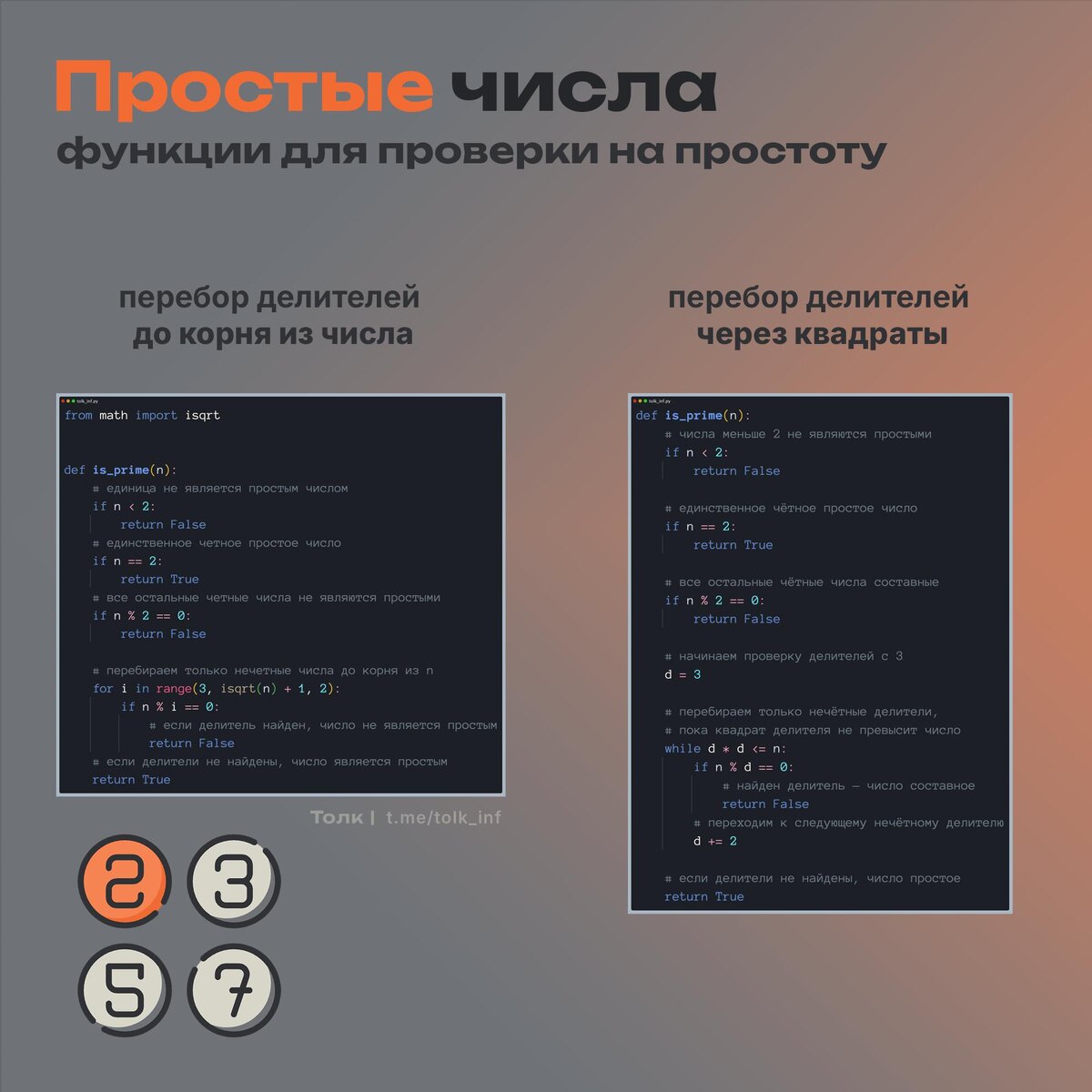 Проверка на простоту регулярно нужна в 25 задаче - одной из самых плохо сдаваемых на ЕГЭ - и иногда встречается как дополнительное условие в других номерах. Оба способа работают быстро за счёт двух вещей: чётные числа пропускаем сразу, делители перебираем только до корня из числа. Это важно - в задачах встречаются числа до миллиона и больше, и наивный перебор всех делителей подряд просто не успеет посчитаться. Первый способ вычисляет корень один раз через isqrt() и передаёт его в range() - граница фиксирована. Второй проверяет d * d <= n на каждом шаге - без импорта из библиотеки math, но чуть медленнее, потому что умножение происходит на каждой итерации. На практике разница несущественная, выбирайте тот, который лучше запомнится. Напишите в комментах, если нужен код без примечаний #инструменты —————— Читайте там, где вам удобнее: VK • TikTok • Max • Дзен • Telegram