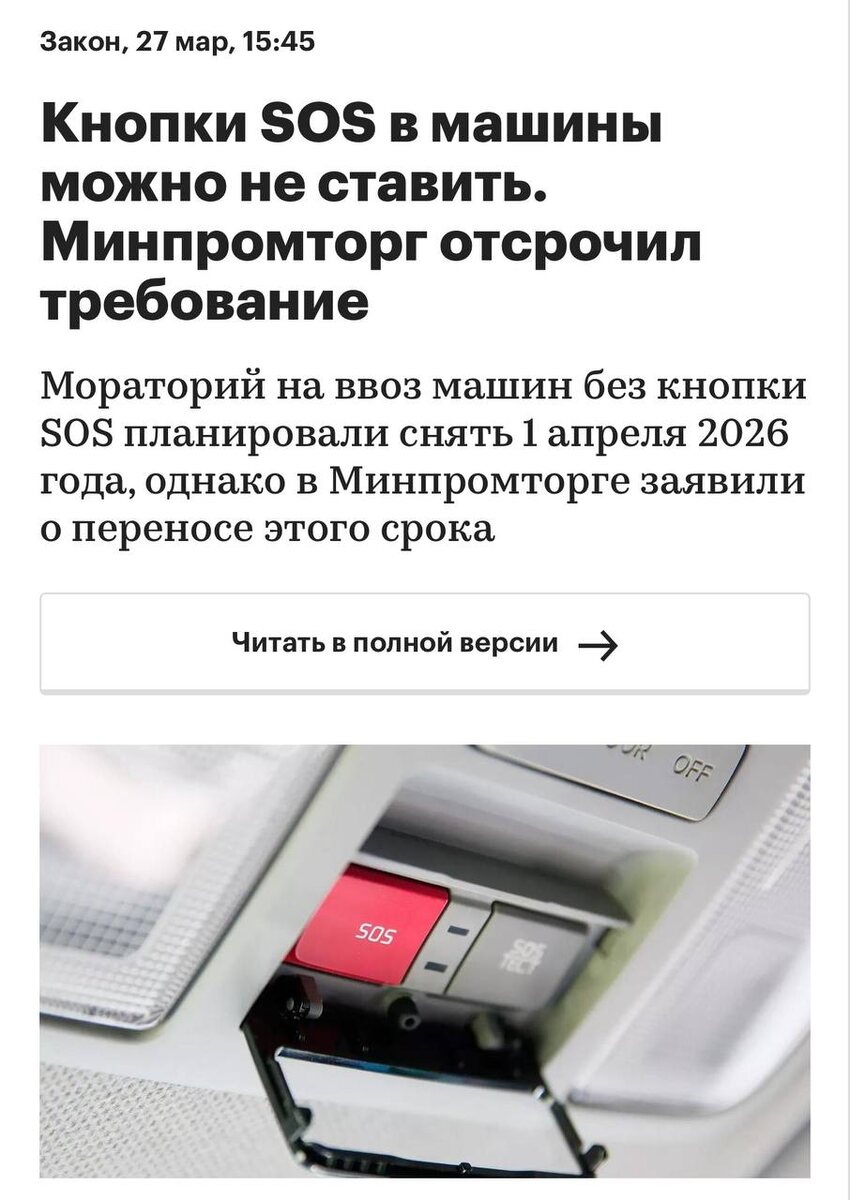 ⭐️⭐️⭐️⭐️⚡️⚡️⚡️⚡️ Минпромторг решил отложить введение обязательного оснащения ввозимых физлицами автомобилей кнопками SOS с ЭРА-ГЛОНАСС на более поздний срок. Сообщили в пресс-службе министерства. «Введение обязательного оснащения транспортных средств, ввозимых физическими лицами, устройствами вызова экстренных оперативных служб с подключением к системе «ЭРА-ГЛОНАСС» с 1 апреля 2026 года не планируется и переносится на более поздний срок», — говорится в сообщении. В Минпромторге добавили, что сейчас соответствующий проект постановления проходит процедуру межведомственного согласования. На автомобилях с установленными блоками системы экстренного реагирования при аварии система вызова оперативных служб срабатывает автоматически. При необходимости вызвать помощь можно и в ручном режиме, нажав кнопку SOS (она же — УВЭОС). АО «ГЛОНАСС» — поставщик и оператор навигационно-телекоммуникационных решений, в частности системы экстренного реагирования при авариях «ЭРА-ГЛОНАСС».