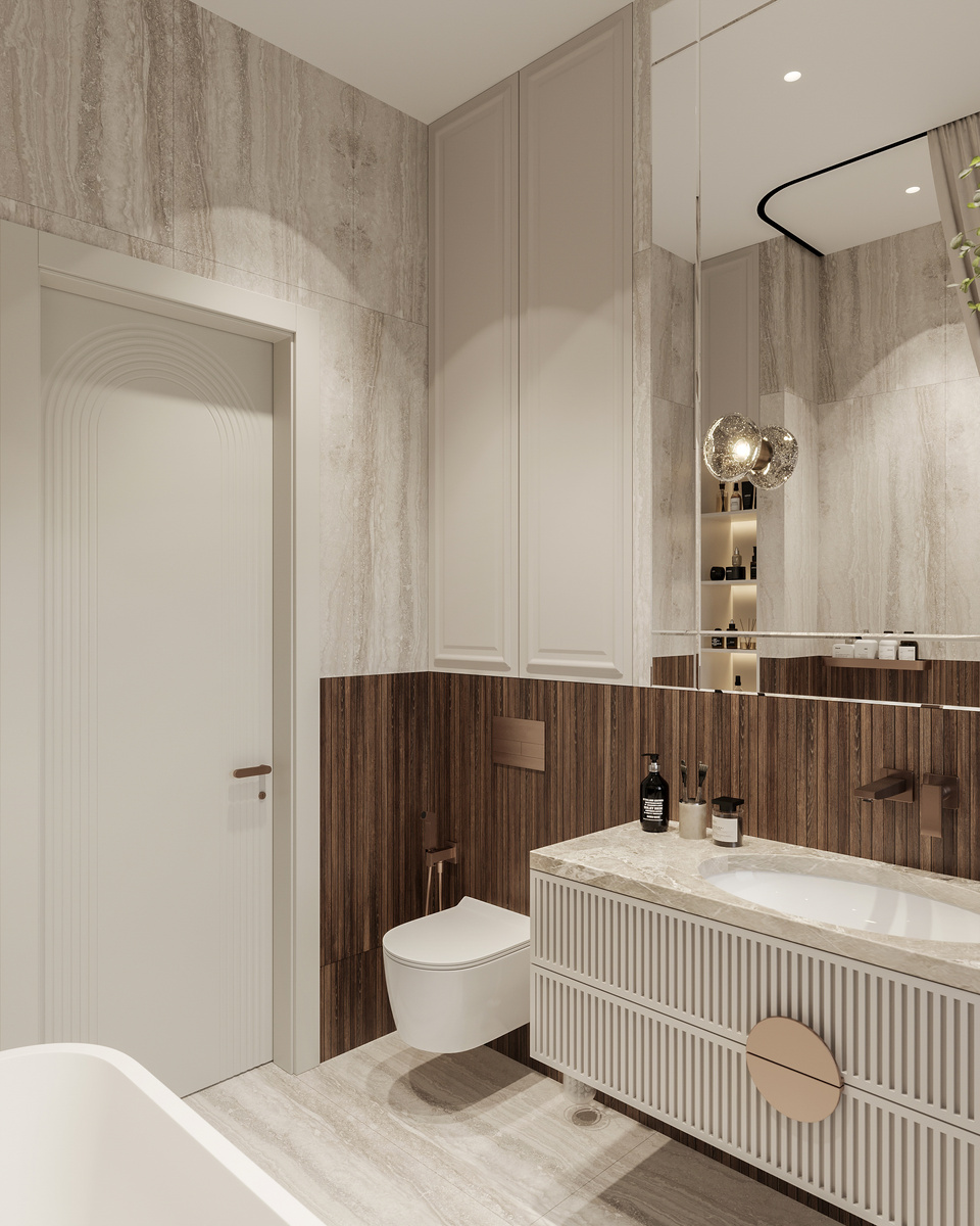 Детская ванная — не значит яркая и игрушечная 🧸🚫 Мы сделали её в общем стиле дома: спокойно, элегантно, но с особым вниманием к деталям ✨ Центральный элемент — большая тумба с раковиной подстольного монтажа и столешницей из искусственного камня 🪨 Сантехника Hansgrohe в бронзе, встроенные смесители 🚰 Зеркало во всю стену визуально расширяет вытянутое пространство 🪞 Над инсталляцией — шкаф хранения, рядом дополнительный шкафчик для косметики 🧴🧽 Всё продумано, чтобы было удобно и порядок не нарушал красоту ✅ Ванна цельная литая со скруглённым углом — стильный и безопасный выбор 🛁✨ Рядом окно с римской шторой и подвес с живой зеленью 🌿💚 Отделка: пол и часть стен — плитка под травертин 🪨 Пояс из порционно-ореховых реек на высоте 1.2 метра добавляет тепла и ритма 🔲🌰 Шторка мягкая, тканевая, с креплением в потолок 🧵 Без стекла — чтобы никакого риска травм ❤️ Только уют и спокойствие 🕊 Даже детская ванная может быть сдержанной, стильной и при этом максимально безопасной 🤍✨ Пон