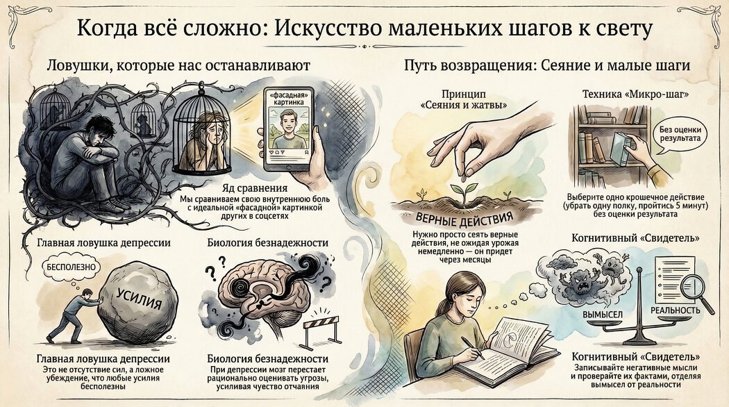 Главная ловушка депрессии — не в отсутствии сил, а в убеждении, что любые усилия бесполезны. Это убеждение можно разобрать, как старый механизм, и собрать заново.