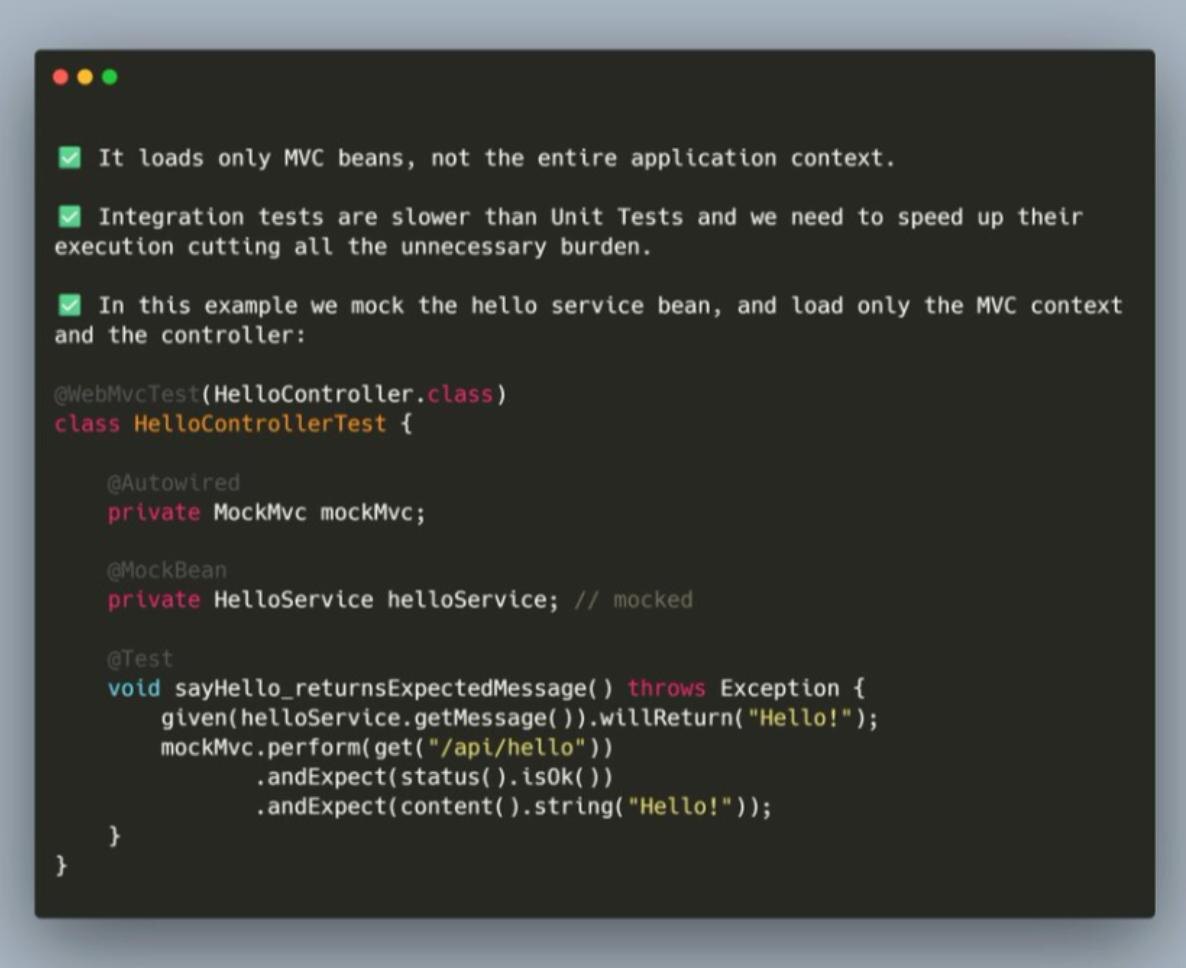 Если тебе нужно тестировать Spring MVC контроллеры, но не хочется поднимать всё приложение — используй @WebMvcTest. Что это даёт - Загружает только MVC-слой, без всего Application Context - Тесты работают значительно быстрее - Можно замокать сервисы через @MockBean - Идеально для проверки контроллеров, статусов и ответов API Когда использовать - Тестируешь REST-контроллеры - Нужно проверить HTTP-ответы - Не нужна база, security, messaging и другие слои Идея простая: Вместо запуска всего приложения → поднимаем только веб-контекст. Меньше зависимостей → быстрее тесты → стабильный CI. Пример @WebMvcTest(HelloController.class) class HelloControllerTest { @Autowired private MockMvc mockMvc; @MockBean private HelloService helloService; @Test void sayHello_returnsExpectedMessage() throws Exception { given(helloService.getMessage()).willReturn("Hello!"); mockMvc.perform(get("/api/hello")) .andExpect(status().isOk()) .andExpect(content().string("Hello!")); } } Если тестируешь тольк