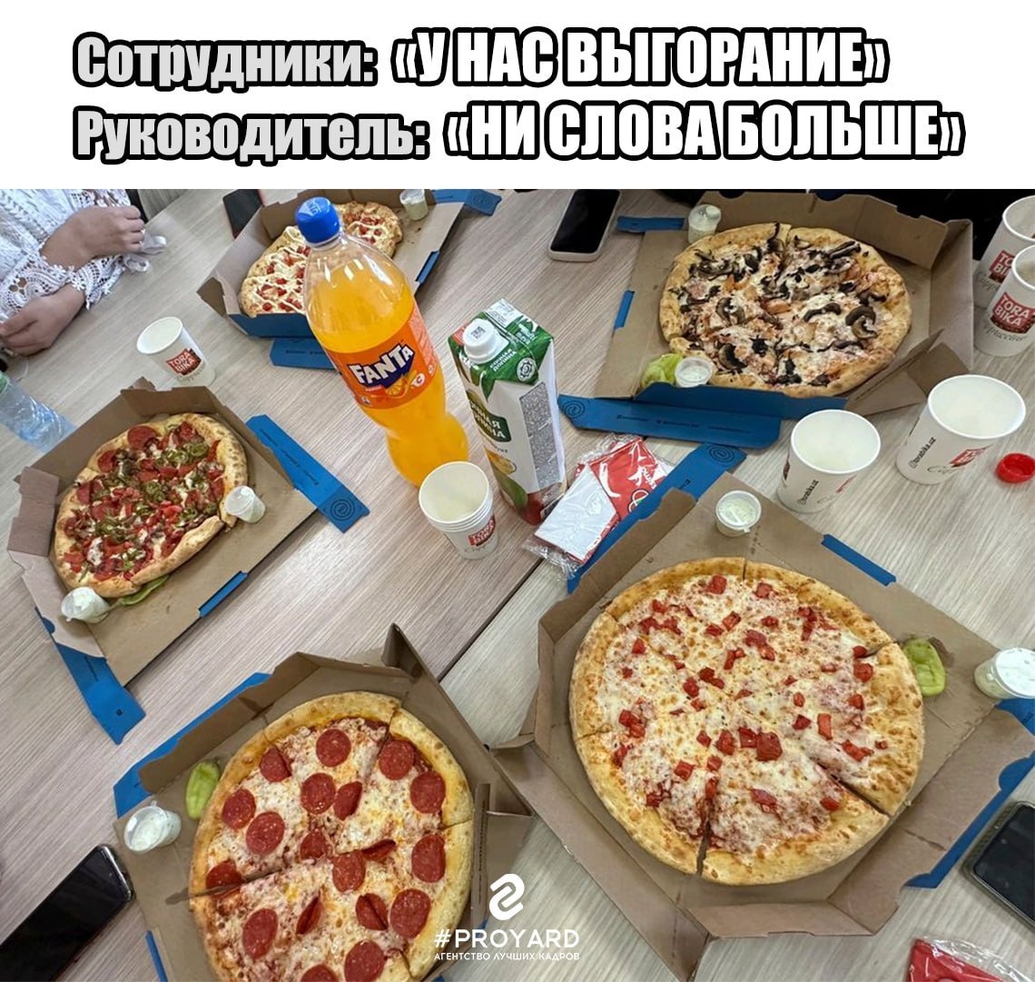 Это про адекватную нагрузку, обратную связь и уважение к людям. Пицца — это приятно, но если за ней не стоит системных решений, команда просто сгорит вместе с сыром. 🍕 А если понимаете, что одной пиццей уже не обойтись — пишите @EvgeniyaYurlova, подскажем, с чего начать. PROYARD - Агентство лучших кадров #PROYARD #корпоративнаякультура #выгорание #управлениекомандой #hrсоветы