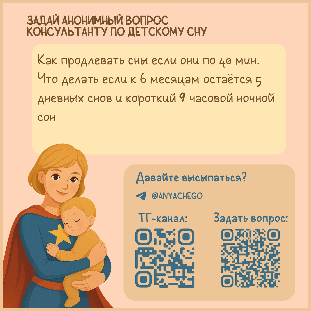 Вопрос от подписчика. Как продлевать сны если они по 40 мин. Что делать если к 6 месяцам остаётся 5 дневных снов и короткий 9 часовой ночной сон В 6 месяцев необходимо организовывать 3 дневных сна. Без организации режима с 3 дневными снами происходят, описанные проблемы: ❌ все сны короткие, бодрствования маленькие, короткий и часто некачественный ночной сон. Почему так происходит: Когда дневных снов слишком много: ➡️ ребенок не успевает накопить достаточное давление сна ➡️ бодрствования остаются маленькими ➡️ сны не могут стать длинными ➡️ ночной сон укорачивается и становится более чутким Получается замкнутый круг: короткий сон - короткое ВБ. Про это подробно рассказываю в видео-разборе Много vs Мало дневных снов (там даже про ваш возраст - 6 месяцев) Почему ребенок не продлевает сны? Так как в вашей ситуации у вас короткая ночь и даже 5 дневных снов, переходить на режим с 3 снами будет непросто - нужно наращивать бодрствования после короткой (и возможно некачественной) ночи. Могу п