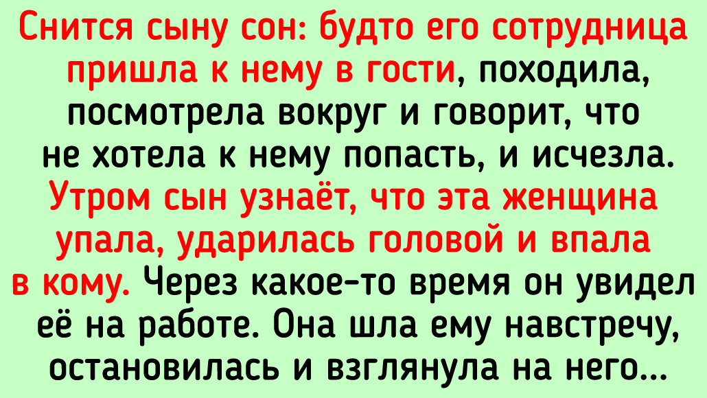 Снится сыну сон: будто его сотрудница пришла к нему в гости, походила, посмотрела вокруг и говорит, что не хотела к нему попасть, и исчезла. Утром сын узнаёт, что эта женщина упала, ударилась головой и впала в кому.