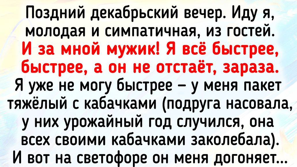 Поздний декабрьский вечер. Иду я, молодая и симпатичная, из гостей. И за мной мужик! Я всё быстрее, быстрее, а он не отстаёт, зараза. Я уже не могу быстрее — у меня пакет тяжёлый с кабачками (подруга насовала, у них урожайный год случился, она всех своими кабачками заколебала). И вот на светофоре он меня догоняет. Я приготовилась, уже любопытно, как мужчина начнёт флирт. И он-таки начал:
