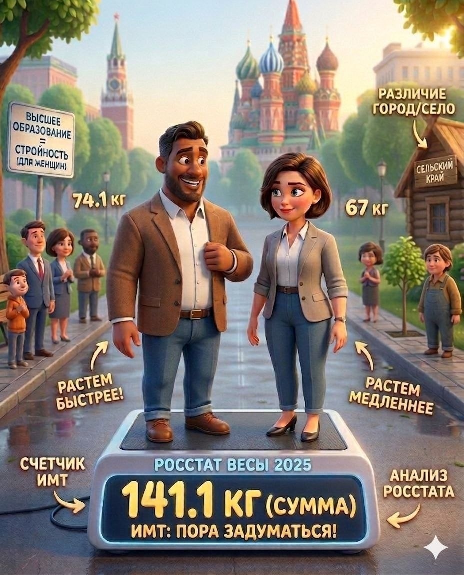 ? Свежие отчеты Минздрава и данные профессора Аллы Погожевой подтверждают: Россия стремительно набирает вес. Если раньше говорили о 18%, то к 2025 году диагноз «ожирение» официально поставлен уже каждому четвертому взрослому. 📈 Шокирующие цифры 2025: Масштаб: 66% россиян (двое из трех!) уже имеют избыточный вес или ожирение. Детская тревога: Почти 500 000 школьников страдают от ожирения. За последние годы рост в этой группе составил рекордные 36%. Мужской тренд: Мужчины продолжают лидировать по скорости набора лишних килограммов, обгоняя женщин. Образование как фильтр: у женщин наличие высшего образования по-прежнему остается мощным фактором защиты от лишнего веса. У мужчин, увы, диплом на ИМТ не влияет. 📍 География и ритм: Жители крупных городов остаются в 1,2 раза стройнее сельских жителей. Доступность ЗОЖ-инфраструктуры и высокий темп жизни в мегаполисах помогают «сжигать» лишнее эффективнее. Итог: Мы движемся к отметке, где здоровый вес становится привилегией осознанных