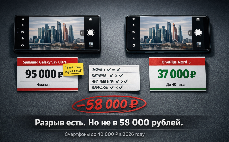 Прошлой осенью друг потратил 95 тысяч рублей на Samsung Galaxy S25 Ultra. Я в тот же месяц взял OnePlus Nord 5 за 37 тысяч. Мы сравнили телефоны в один вечер - фотографии в разных условиях, скорость открытия приложений, экран. Разрыв был. Но не в 58 тысяч рублей разрыв. Совсем не в такой разрыв.