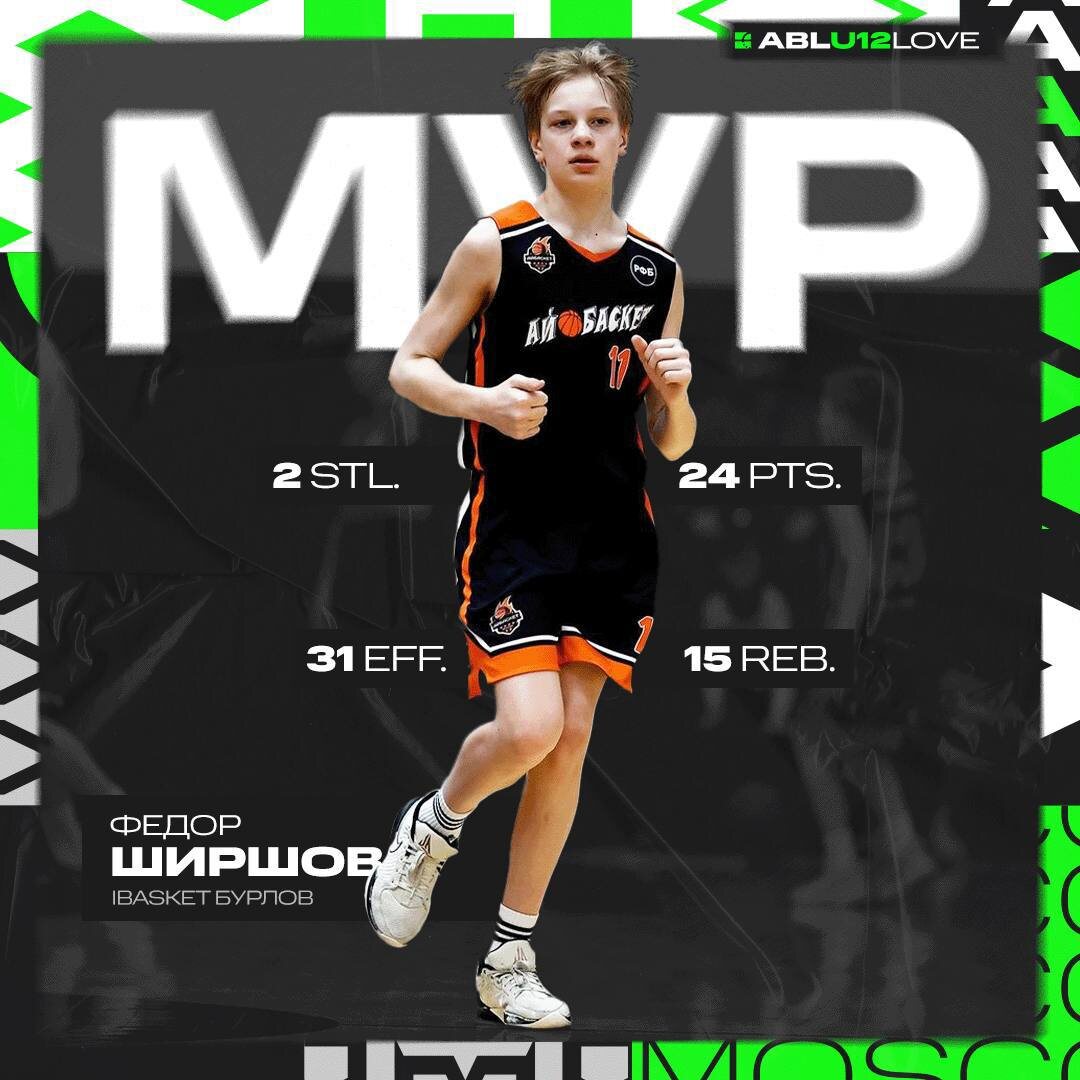 Ширшов Федор (IBasket Бурлов) vs Спортивный клуб «Вектор» U12 Love 18 тур 47:44 24 очка, 15 подборов, 2 перехвата, 31 эффективность IBasket Евгения Бурлова наконец-то обыграл "Вектор" с четвертой попытки! В первую очередь команда хорошо сыграла в защите, против меньше 45 очков, а во вторую прекрасная индивидуальная игра Федора Ширшова. Ширшов стал лидером встречи по очкам и подборам, продемонстрировав при этом великолепную бросковую эффективность: 9/14 2-очковые, 6/10 штрафные. Федор отыграл без замен все 40 минут и стал автором победных штрафных бросков, забив 4 штрафных подряд в финальной части игры. 📱Наш сайт 📱Группа Вконтакте 1️⃣@ABL Moscow