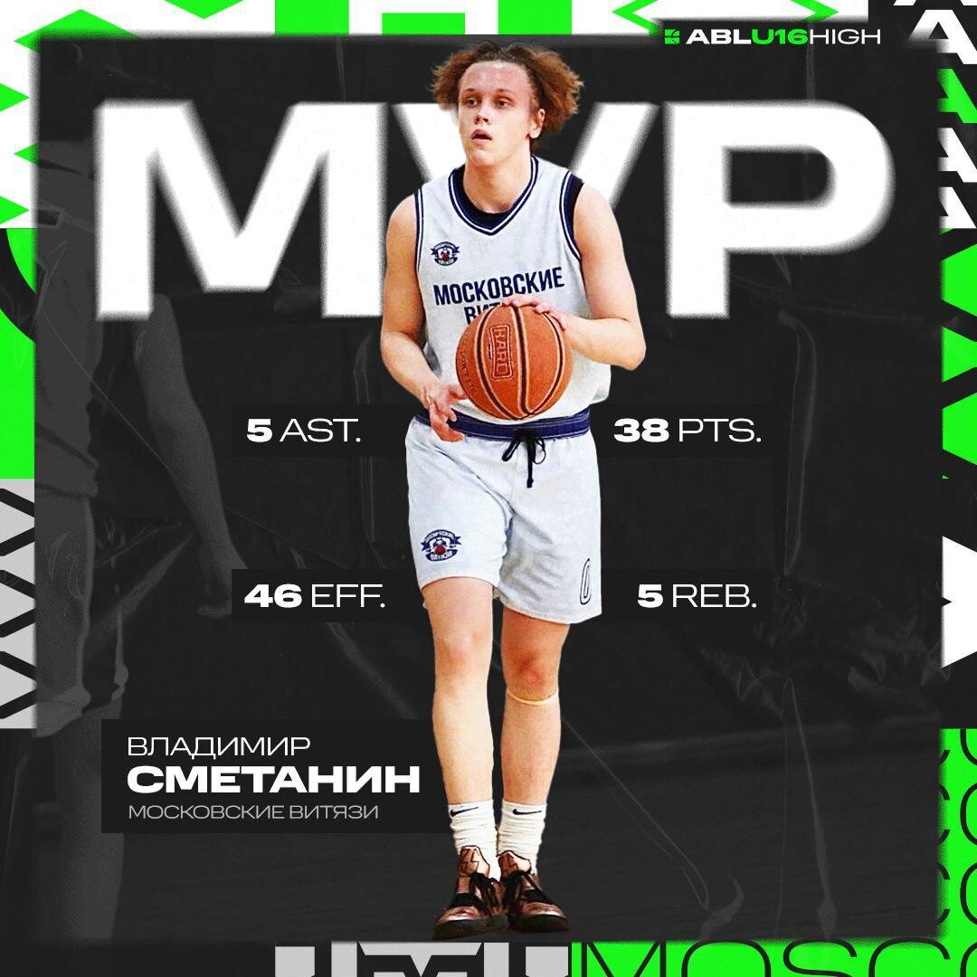 Сметанин Владимир (Московские Витязи) vs Korolev Rockets U16 High 18 тур 93:53 38 очков, 5 подборов, 5 передач, 46 эффективность Пропустивший два месяца Владимир Сметанин с ноги влетел в 18 тур, оформив монструозный перфоманс в матче с Korolev Rockets. Владимир смазал пару данков в первой четверти, но начиная со второй десятиминутки перестал промахиваться вообще. В итоге Сметанин забил 33 очка за три четверти, реализовав 16 из 17 бросков с игры. Ждем возвращения Жеребко и воссоединения Большого трио Сметанин-Лыхо-Жеребко в полном составе! 📱Наш сайт 📱Группа Вконтакте 1️⃣@ABL Moscow