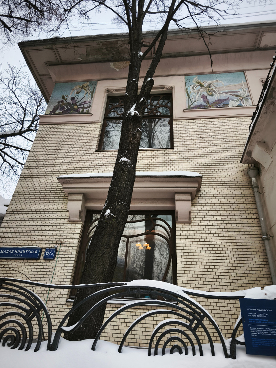На Малой Никитской расположена городская усадьба, построенная архитектором Фёдором Шехтелем для предпринимателя Степана Рябушинского в 1900—1903 годах. Это — один из самых ярких примеров раннего модерна в русской архитектуре. В интерьерах этого здания Шехтель формирует образ подводного царства, где ключевую роль играет центральный вестибюль со спиралевидной лестницей-«волной». Изогнутый парапет лестницы переходит в витраж, знаменующий встречу воды и воздуха. Атмосфера подводной жизни имитируется благодаря цветовому оформлению: сочетание серо-зелёного мрамора, из которого изготовлена лестница, светло-зелёных стен и игры света, созданной с помощью соседства тонированных стёкол витражей и матового потолка. В создании мифологической атмосферы важную роль играет и светильник-«медуза», венчающий гребень волны: его витражная вставка в синих и фиолетовых тонах создаёт эффект фосфоресцирующего свечения и наполняет помещение цветными тенями.