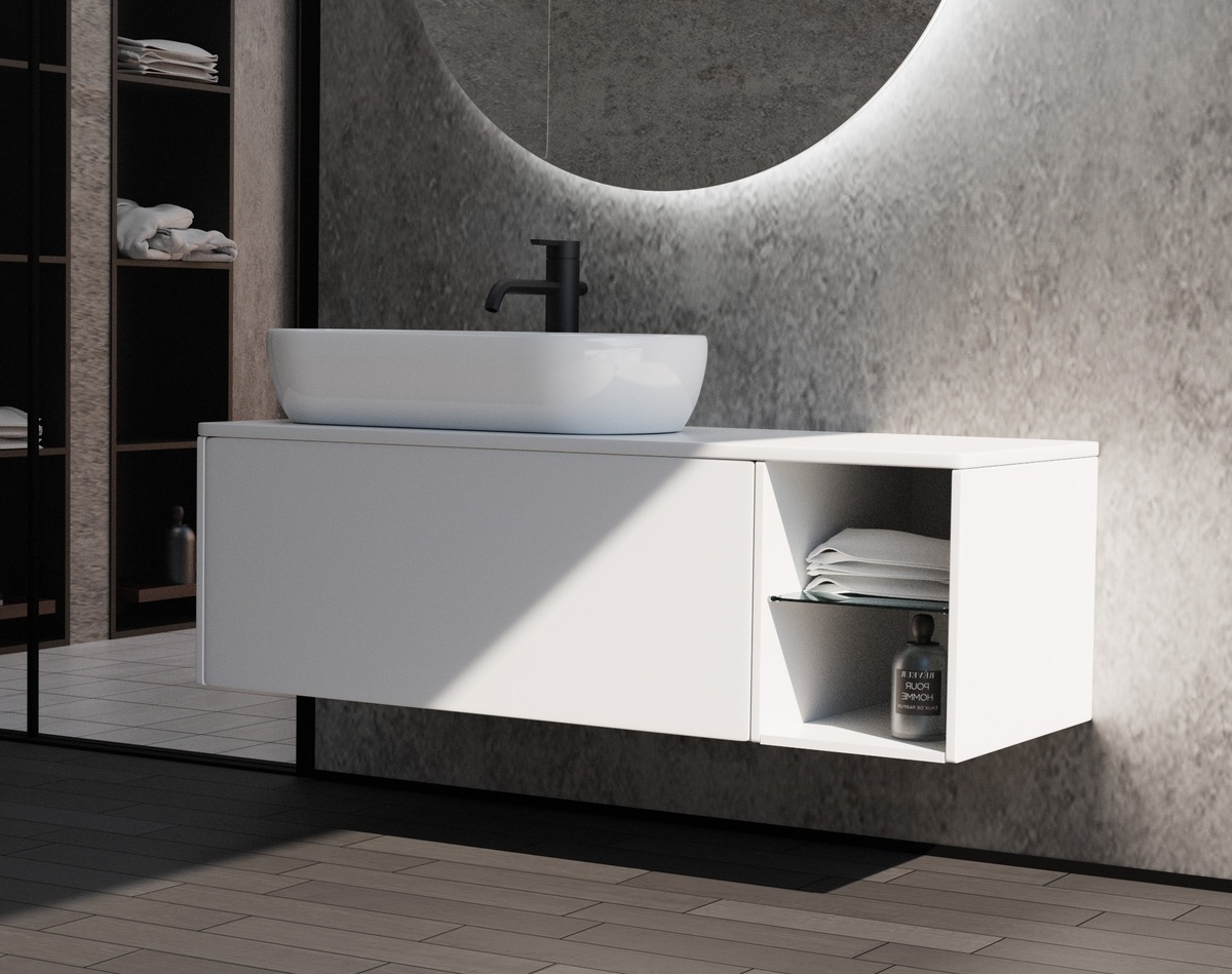 Поскольку раковина устанавливается сверху, внутреннее пространство тумбы остаётся полностью свободным. Нет вырезов под раковину, нет сифона, мешающего ящикам. Всё пространство можно использовать для хранения.