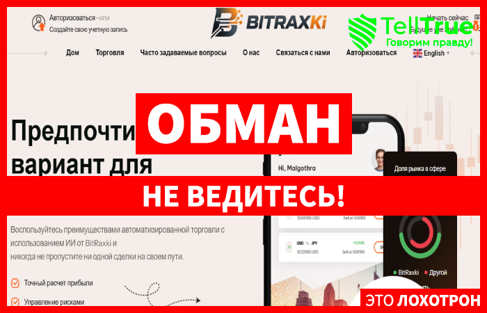 Очередные мошенники выдают себя за приличного брокера и пишут «Воспользуйтесь преимуществами автоматизированной торговли с использованием ИИ от BitRaxki и никогда не пропустите ни одной сделки на своем пути.». Проект BitRaxki (bitraxki.com) позиционируют, как надежного и проверенного брокера, но фактически он является мошенническим творением, ориентированным на выманивание денег, соответственно стоит быть осторожнее и не связываться с представителями этого примитивного лохотрона. Полный обзор: https://telltrue.net/eto-lohotron/bitraxki/