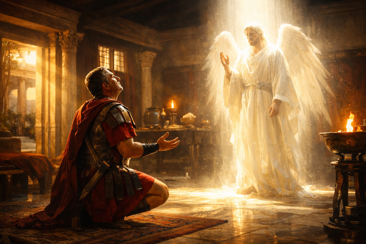 В Кесарии, городе шума и римской власти, жил человек, которого называли Корнилий. Он был сотником, привыкшим командовать и подчиняться. Но сердце его не принадлежало ни золотым орлам легионов, ни мраморным богам, что стояли в нишах. Он был язычник по крови, но верой своей давно стоял у дверей Бога Израилева. Он был человеком молитвы. В то время как другие сотники отдавали приказы на плацу, Корнилий в девятый час уединялся в своем доме, обращая лицо к небу. Дом его стал островком света: он боялся Бога, творил милостыню и научил свой дом искать Господа. Однажды, когда день клонился к вечеру и молитва его поднималась вместе с фимиамом к престолу, он вдруг увидел ясно, ангела Божия. Свет вошел в его жилище, и страх сковал уста сотника. — Корнилий, — произнес посланник, и голос этот был тверже, чем звук военной трубы, но мягче, чем шепот матери. Корнилий поднял глаза, чувствуя, что стоит на пороге чего-то великого. — Молитвы твои и милостыни твои пришли на память пред Богом, — сказал ангел