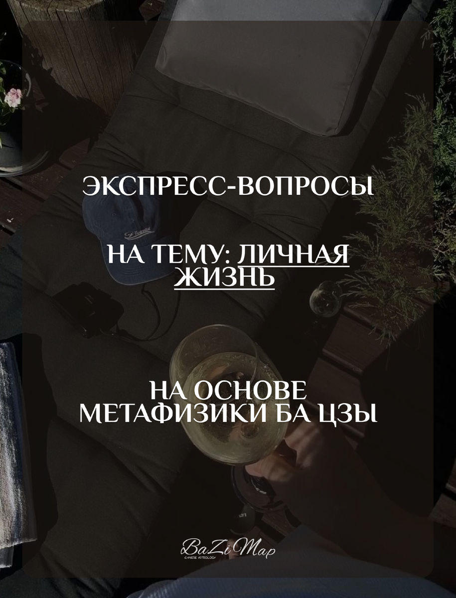 Экспресс-вопросы на тему: личная жизнь на основе метафизики ба цзы вопросы на тему: Личная жизнь Я сейчас в удачном периоде или нет? Стоит ли мне что-то менять в жизни сейчас? Есть ли риск резких проблем в ближайшее время? Почему в жизни всё идёт нестабильно? Есть ли у меня «чёрная полоса» сейчас? Когда станет легче? Есть ли риск серьёзных ошибок? Я двигаюсь в правильном направлении или нет? Формат: 1 вопрос = 1000 ₽ Ответ: да / нет / вероятность + причина по карте