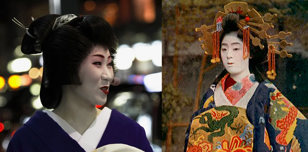 Макияж гейши также играет ключевую роль в формировании ее образа. Белая основа, наносимая на лицо, символизирует чистоту и невинность, а яркие красные и черные акценты на губах и глазах подчеркивают красоту и элегантность. Каждая линия и оттенок имеют свое значение: тонкие брови, нарисованные в форме дуги, олицетворяют утонченность, в то время как красные губы акцентируют внимание на способности гейши вести беседы и развлекать гостей. Использование различных аксессуаров, таких как канзаши (оригинальные заколки для волос), также говорит о статусе и мастерстве гейши.