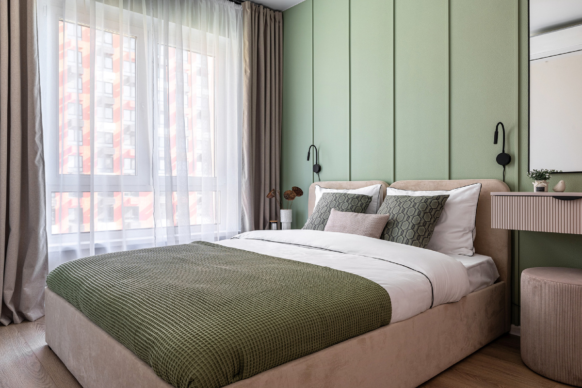 Пастельная симфония: современная евродвушка 32,1 кв.м в дымчато-зеленых тонах