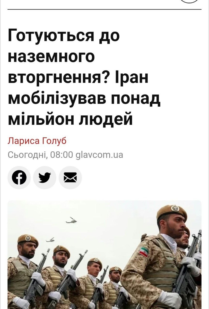 ! Пока Трамп рассказывает сказки позитивных переговорах с Ираном, в самом Иране все готовы к большой войне. Тегеран заявляет о полной готовности к отражению возможной наземной операции Пентагона. В вооружённые силы массово призывают ополченцев "Басидж", в то время как США продолжают наращивать группировки в регионе. Иранские государственные СМИ сообщили о мобилизации более 1 миллиона человек для защиты страны от возможного вторжения американских сухопутных войск. По данным Тегерана, в армию и Корпус стражей исламской революции вступили сотни тысяч добровольцев. Помимо регулярных частей, задействовано военизированное ополчение "Басидж". "Для наземного противостояния с американскими войсками было мобилизовано более миллиона иранских солдат", – сообщают СМИ. 🔺Вот и настали такие времена, что ты можешь проснуться завтра и... и слава Богу, что проснулся. Телеграм-канал Александр Семченко