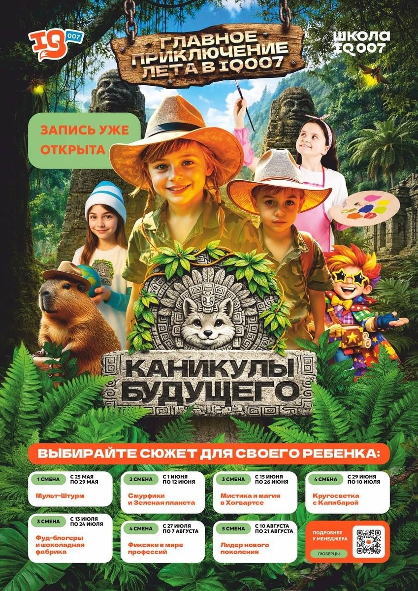 ! Пока вы на работе, ваш ребенок проводит каникулы ярко, а не в экране телефона. В IQ007 мы превращаем отдых в прокачку мозга в кругу новых друзей! Каникулы будущего с IQ007 — спасение для родителей, если: 🔹 Ребёнок не выпускает телефон из рук и скучает дома; 🔹 Вам нужен надежный присмотр с 08:00 до 19:00; 🔹 Вы хотите, чтобы за лето знания не «выветрились», а приумножились; 🔹Ребёнку не хватает живого общения и активных игр. Что ждет ребенка: ✅ 7 тематических смен: от Хогвартса до IT и ораторского искусства; ✅ Прокачка памяти, логики и интеллекта в играх; ✅ 3-разовое питание, прогулки на свежем воздухе и новые друзья. 📅 Стартуем 25 мая! Смены по 5 и 10 дней ⚡️Только сейчас раннее бронирование по спеццене -30% 👉Успейте забронировать место! 📍 Комсомольский проспект, 18Б 📞+7 901 350 6579 ❗️Возможно оплата маткапиталом. 💸Вернем налоговый вычет 13%. 🎓 Для детей 6-14 лет.