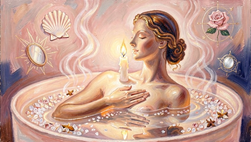 ✨ Наполни ванну тёплой водой, добавь горсть розовой соли и каплю масла розы или иланг-иланга. Пока вода набирается, зажги свечу. Это твой алтарь красоты. Погрузись, закрой глаза и положи ладонь на сердце. Дыши медленно, представляя, как с каждым выдохом уходит напряжение, а с вдохом — розовато-золотой свет наполняет тебя изнутри. Шепни про себя: «Я принимаю себя. Я — гармония». Пятница — день Венеры, энергии любви и изящества. Этот простой ритуал помогает ей мягко проявиться в тебе: растворить жесткость, напомнить о природной грации и той тихой радости, что живёт в сердце💖 Вытираясь полотенцем, поблагодари своё тело. И просто останься в этом чувстве — ты уже прекрасна.