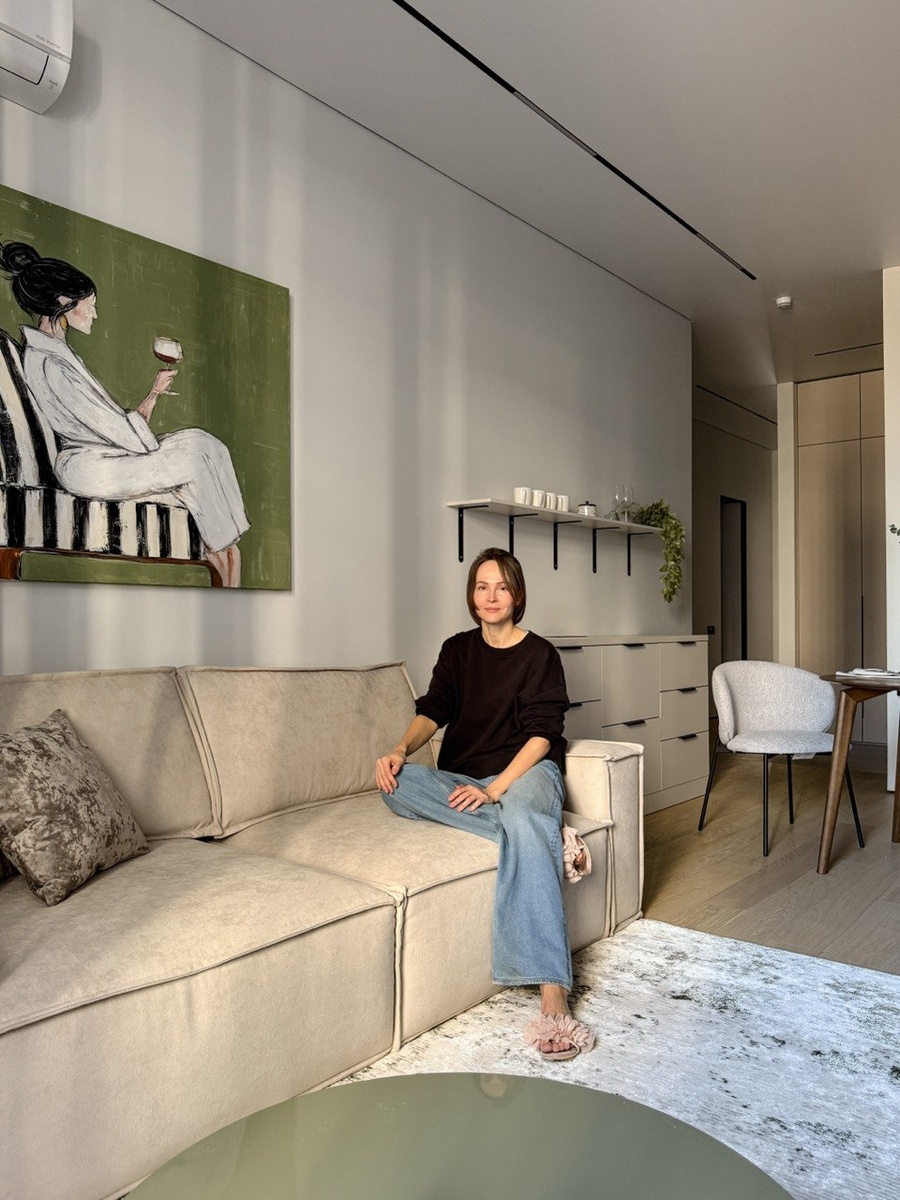 Этот легендарный ЖК много видела на билбордах, и вот оказалась в нем на комплектации. Бизнес-класс с уклоном в премиум, лобби с консьержем, потолки 3 метра, теневой плинтус, теневой натяжной потолок, двери скрытого монтажа, теплый пол в прихожей и санузлах, готовое освещение, кухня с техникой и пр. И да, именно тут местные рабочие запросили у нас 160 тысяч за перенос двух розеток))) Да, и если мы еще не знакомы: меня зовут Лена Володина, я профессионально занимаюсь инвест-ремонтами и комплектацией квартир под сдачу, а потом зачастую помогаю клиентам их выгодно сдать. Более оперативно о своих объектах рассказываю в своем телеграм-канале "Пока меня не было" и на канале в MAX. Для этого проекта я выбрала природную цветовую гамму – приглушенный зеленый, кашемир, темное дерево. От такого не устаешь, она смотрится благородно и дорого. Вот такую визуализацию предложила клиентке. Кухню от застройщика клиентка попросила “нарастить” до потолка, решили эту задачу фасадами в цвет столешницы и сте