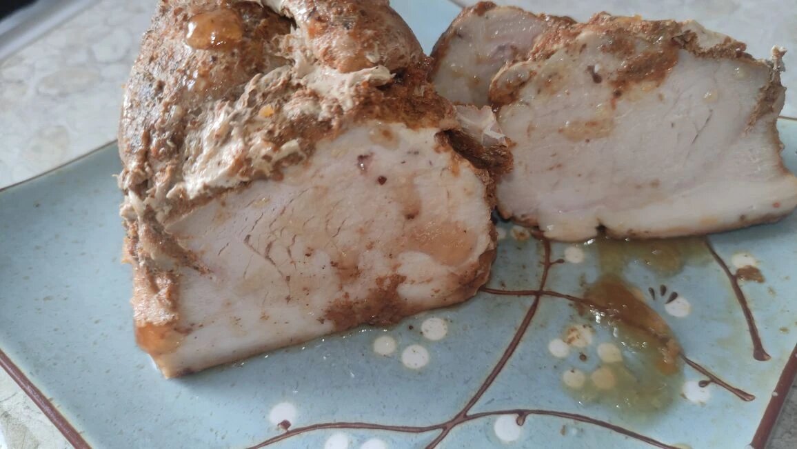 Ингредиенты: 700 гр. в меру жирного куска свинины без кости, 1 ст. л. аджики, 1 ст. л копченой паприки, 1/2 ст. л. сушеного молотого чеснока, 1 ст. л. растительного масла, соль - по вкусу 1. Все ингредиенты, кроме мяса соединить. 2. Получившейся смесью намазать мясо и оставить в холодильнике минимум на 12 часов, лучше на сутки. 3. Замаринованное мясо завернуть сначала в пергамент, а затем в фольгу. 4. готовить при температуре 160 C 1-1час 20 минут. 5. Готовое мясо вынуть из духовки и дать полежать минут 15-20, не разворачивая мясо. 6. Есть можно как в горячем, так и в холодном виде.