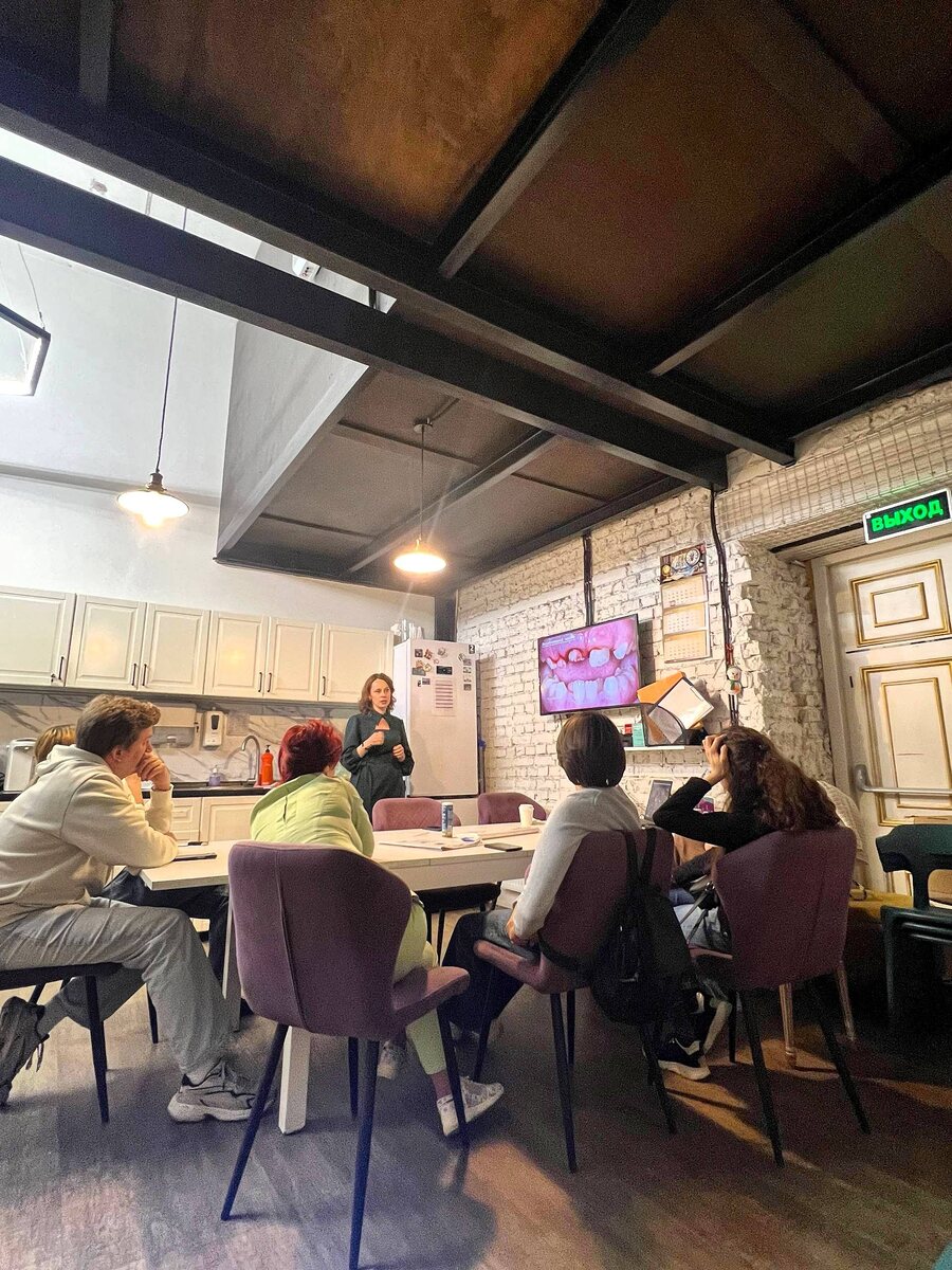 В нашем филиале на Проспекте Мира, где я руковожу детским отделением, мы проводим очные встречи внутри команды, раз в несколько месяцев. Это формат круглого стола, когда мы собираемся и обсуждаем одну тему, делимся кейсами, тактиками, опытом. У нас в компании много сильных спикеров, и кто-то может взять тему и разобрать её, при этом это всегда диалог, а не лекция. Мы открыто обсуждаем: • клинические случаи, • сложные решения, • свои сомнения и находки. И очень важно — мы подключаем разные специализации: детская стоматология, ортодонтия, хирургия, ортопедия. Смотрим на ситуацию с разных сторон. Сегодня, например, у нас был такой круглый стол по теме первой помощи при травме. И я поймала себя на мысли 👉 таких форматов очень мало вне клиник. Есть много обучений, где есть лектор и слушатели, но почти нет пространств, где каждый может принести свой кейс и обсудить его с коллегами. И у меня появилась идея — сделать такие встречи уже вне клиники. Формат: не обучение, а именно профессионально