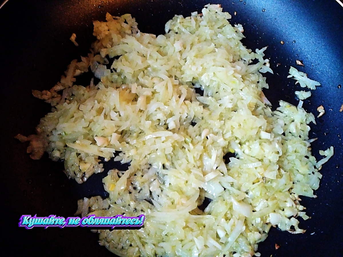 На среднем огне разогреваем в сковороде оливковое масло и пассеруем лук с чесноком до золотистого цвета.