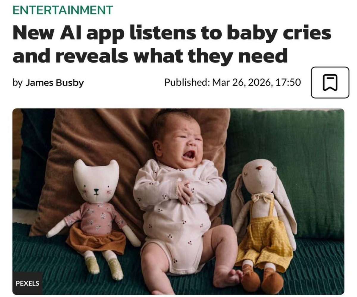 Нейросеть, обученная на десятках тысяч записей, определяет, чего хочет ребёнок: голод, усталость, дискомфорт или потребность в отрыжке. Алгоритму достаточно 5–10 секунд аудиозаписи. С 20 апреля доступ к приложению начнут выдавать матерям бесплатно в префектуре Сидзуока. Японцы живут в 2126.