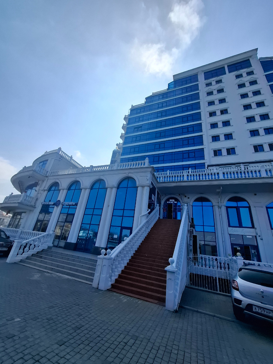 Ну конечно первое, что мне очень нравится , я поселилась там, где хотела. Хоть оно и стоило каких то навыков, и некоторого напряжения, но цель оправдывает средства. И если бы не лестница, которую я боялась, вообще бы не заморачивалась на переезде в Севастополь. Но, рассказала уже, как мне повезло с водителем такси, поэтому заселение пережила легко и вдохновенно. Просто потому, что очень хорошо себя чувствуешь тогда, когда мечты сбываются. А в этом году я уже второй раз оказалась в месте, на которое глядела с вождением в первый год моей зимовки. Эти синие стекла не давали мне покоя. А водитель такси сказал, что севастопольцы это здание называют голубым унитазом. Загадочное название.